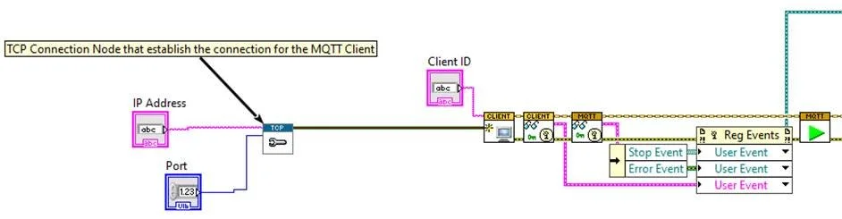 The illustration above shows a brief overview of the entire block diagram used in making the LabVIEW MQTT Client Demo, from the start of the MQTT client, the main function loop of every event, to the disconnection and stop function of the MQTT client (with any occurred error messages). The entire block diagram also has comments pointing to various nodes to help users understand the MQTT package and the various parts used to make the demo.