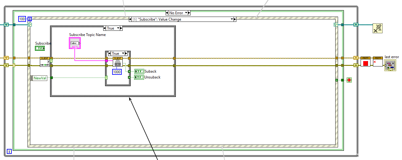 The subscribe event structure is where the Subscribe (Scalar) node takes in the topic name and timeout. It will stay subscribed to the inputted topic name unless the user clicks the subscribe button to unsubscribe. It is possible to have multiple Subscribe (Scalar) nodes or a Subscribe (Array) node to subscribe to multiple topics.
