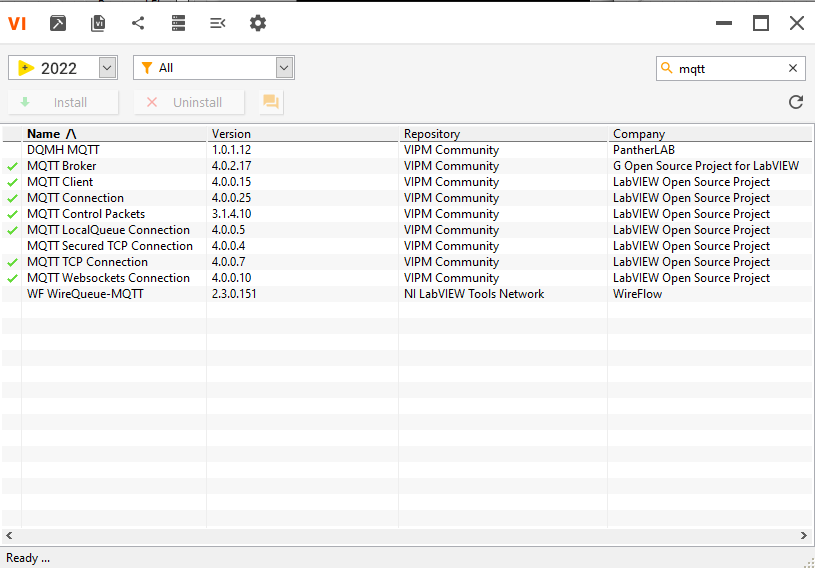 To download the MQTT packages, go to the search bar in the VI Package Manager and type in MQTT. It will list the various MQTT packages that LabVIEW has available.