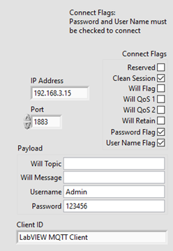 After inputting the correct connection parameter settings, clicking the Connect button will attempt a connection between the LabVIEW MQTT Client to the EDM MQTT broker. It may be necessary to reconnect if it does not succeed the first time.