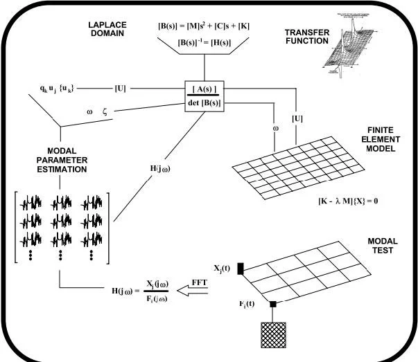 This pretty much summarizes the process - except one important thing needs to be addressed. Up until now we have only discussed using the mass, damping and stiffness approximations to compute system characteristics from the finite element model or from the Laplace domain representation of the system. Both these approaches use approximations of the physical parameters of mass, damping and stiffness to describe the system and so they will both provide the same basic information. If there were some other way to estimate those FRFs without assuming physical properties then I could employ the modal parameter estimation techniques to extract the desired information.