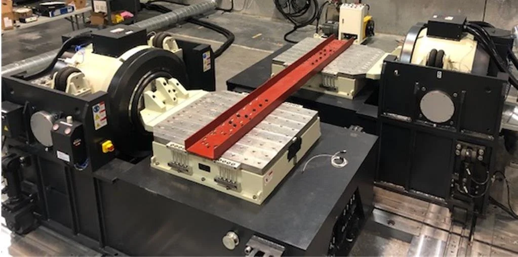 MESA testing frequently used due to its higher force rating and extended shaker table size compared to a single shaker configuration. Larger and heavier Units Under Test (UUT) are accommodated. The following image displays a MESA system in the horizontal configuration for transverse testing.