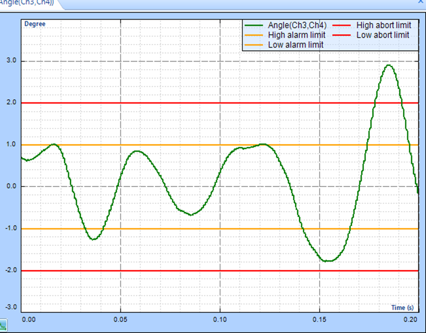 The calculated angular displacement tolerance of 2 degree is exceeded when the testing level is increases. The test aborts immediately after it is detected.