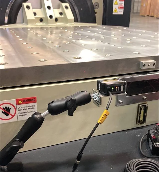 Laser sensor calibration is required due to the impact of the installation. A side-by-side calibration is recommended to be performed with another laser displacement directly measuring the shaker table displacement. The correct sensitivity of the installed laser displacement sensor can be accurately calibrated with readings from these two laser sensors.