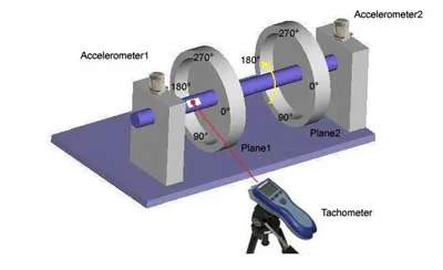 Movement: Directionality when measuring the angle of the vibration must be noted. In Figure 5 a laser tachometer is used. A piece of reflective tape is detected by the laser and represents the zero-degree point, the yellow arrow between the rotors shows the direction of rotation. The angles shown on the rotors show the "Against Rotation" angle measurements in which positive angles are counted in the opposite direction of the shaft rotation. For "With Rotation" measurements, the 90 and 270 degree position would switch places.